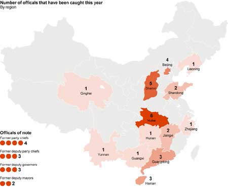 Bản đồ trên được vẽ ra như một phần chiến dịch tuyên truyền nhằm thuyết phục công chúng rằng các lãnh đạo hiện nay rất nghiêm túc trong việc trục xuất các quan chức có hành vi xấu.