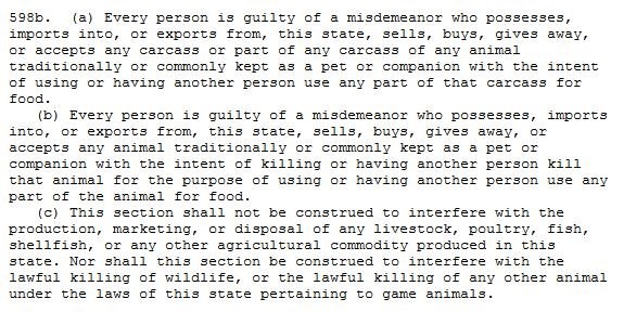 Quan trọng hơn, theo luật pháp của bang California (xem bản gốc tại đây), mọi hành vi bán hoặc ăn các loại thịt từ động vật truyền thống được nuôi làm cảnh, hoặc sống cùng con người (companions)… đều bị cấm và người vi phạm sẽ bị khép vào khung tội tiểu hình.