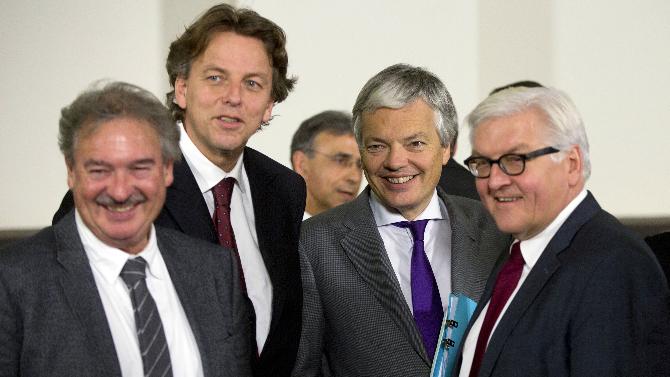 Ngoại trưởng Steinmeier (ngoài cùng bên phải) và ngoại trưởng các nước tham gia Hội nghị của NATO tại Brussels (Ảnh AP)