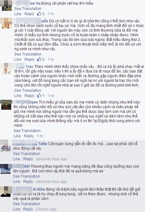 Được biết, chàng trai đi mua đồ ăn, vì không muốn mẹ tâm thần chạy lung tung nên đã dùng dây xích cổ lại. Chưa cần biết đúng sai nhưng khi nhìn hành động này, bất kỳ ai cũng cảm nhận được sự ngược đãi, nhẫn tâm với người bệnh già yếu.