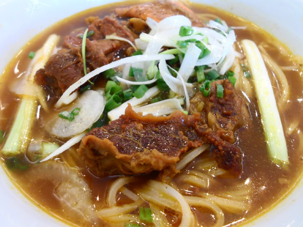 Bước 4: Bánh phở chần qua nước sôi, sắp hành, rau mùi lên trên. Tiếp đó, múc 1 muôi gân hầm rải đều lên, sau đó chan nước dùng lên thật đều.