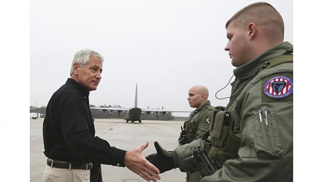 Bộ trưởng Quốc phòng Mỹ Chuck Hagel (trái) chào đón hai thành viên của không quân Mỹ trước khi lên máy bay của mình để khởi hành trên một chuyến đi nước ngoài tại Joint Base Andrews, Maryland vào ngày 5 tháng 12, năm 2014. Có thêm 1.000 binh sĩ Mỹ sẽ ở lại Afghanistan trong năm tới để đáp ứng sự thiếu hụt tạm thời trong lực lượng NATO, Bộ trưởng Quốc phòng Mỹ Chuck Hagel cho biết hôm thứ Bảy trong chuyến thăm Kabul. - PHOTO: REUTERS