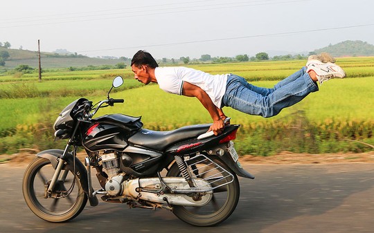 Anh Gugulothu Lachiram biểu diễn yoga trên chiếc xe máy đang lao nhanh ở Telangana - Ấn Độ. Người đàn ông 40 tuổi này đã nâng cấp phương pháp tập luyện cổ xưa của Ấn Độ lên tầm cao mới.