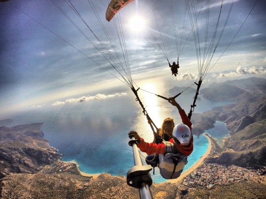 Kẻ mê mạo hiểm Huseyin Burak Tuzer chụp ảnh “tự sướng” khi đang bay cùng dù lượn dọc bờ biển Thổ Nhĩ Kỳ.