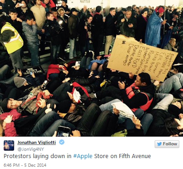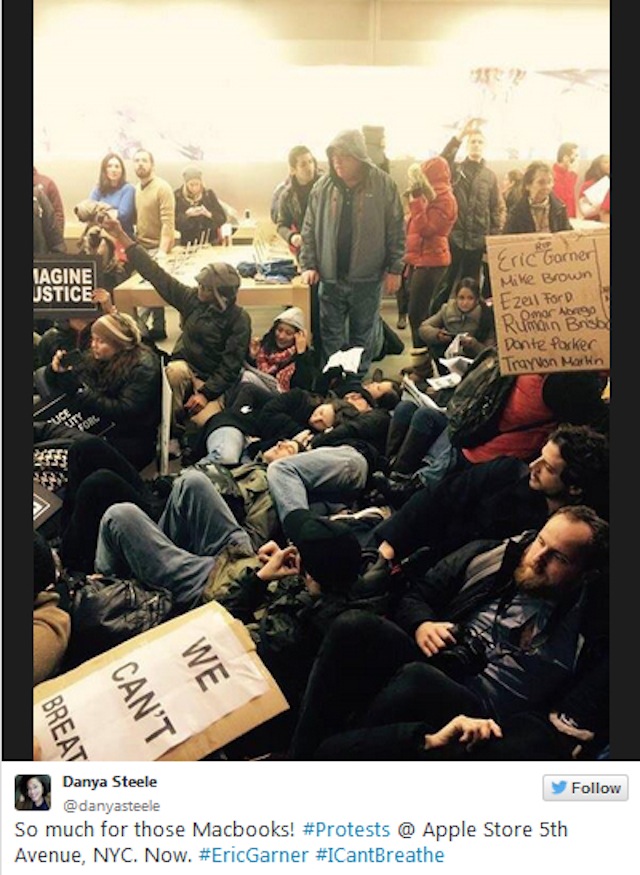 Một số lượng lớn người biểu tình, có thể là khoảng 100 người đã tràn vào cửa hàng Apple Store ở đường Fifth Avenue để thực hiện phong trào 'die-in' hay giả chết bằng cách nằm la liệt trên sàn của cửa hàng. Phong trào này được tổ chức sau khi chính quyền thành phố New York không truy tố một cảnh sát có hành vi tra tấn một nghi phạm khiến anh này chết chỉ khoảng một giờ sau đó.