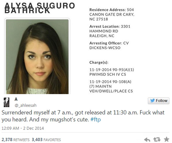 Được biết, cô gái 18 tuổi sống tại thành phố New York, Mỹ đã bị cảnh sát bắt giữ với tội danh sở hữu thuốc cấm nhằm mục đích buôn bán và vận chuyển. Alysa bị bắt vào ngày 2/12 từ lúc 7h sáng cho tới 11h30' cùng ngày.