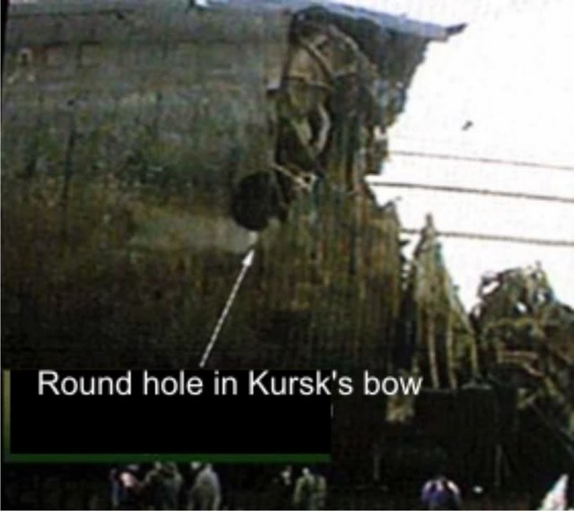 Nghi vấn trên càng trở nên rõ nét khi xác tàu ngầm Kursk được trục vớt vào năm 2001 đã cho thấy trên thân tàu có một vết lõm hướng vào trong.