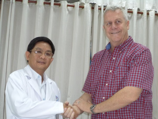 Luât sư Dale E. Washington bắt tay và nói lời cảm ơn đến bác sĩ Lê Văn Tuấn, trưởng khoa Chấn thương Chỉnh hình, Bệnh viện Chợ Rẫy- người đã trực tiếp thực hiện ca phẫu thuật nối gân gót chân thành công cho ông