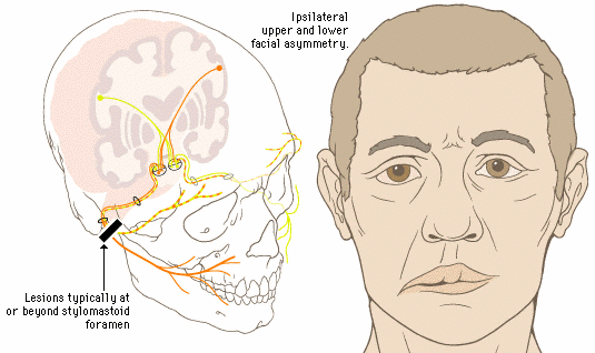 Liệt thần kinh số 7 ngoại biên có thể xảy ra bên phải hay bên trái. Nếu liệt bên nào thì nếp nhăn trán, nếp nhăn mũi - má bên đó mờ. Nhân trung lệch về bên lành. Nếu ăn cơm sẽ đọng lại bên bệnh.