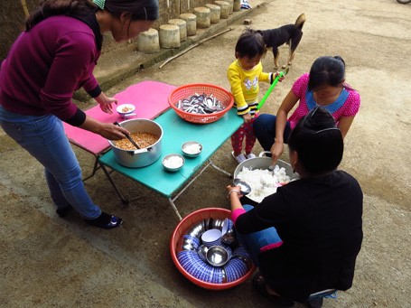 Chuẩn bị đến giờ ăn trưa, sau khi nghe tiếng hướng dẫn của cô giáo, các em đứng cầm theo ghế đang ngồi đến hành lang lớp học đặt ghế xuống. Sau đó, các em lớp lớn phụ giúp khênh bàn ghế chuẩn bị bữa ăn.