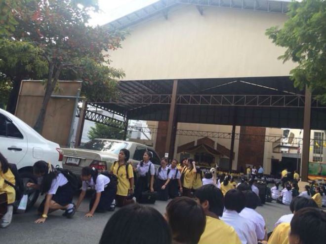 Hình ảnh các nữ sinh trường Khlong Toei, Thái Lan bị trừng phạt bằng cách đi bằng đầu gối trên sàn bê tông khiến cộng đồng mạng phản ứng gay gắt.