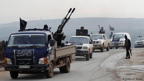Đoàn xe chở các chiến binh nổi dậy Syria di chuyển trên một con đường.
