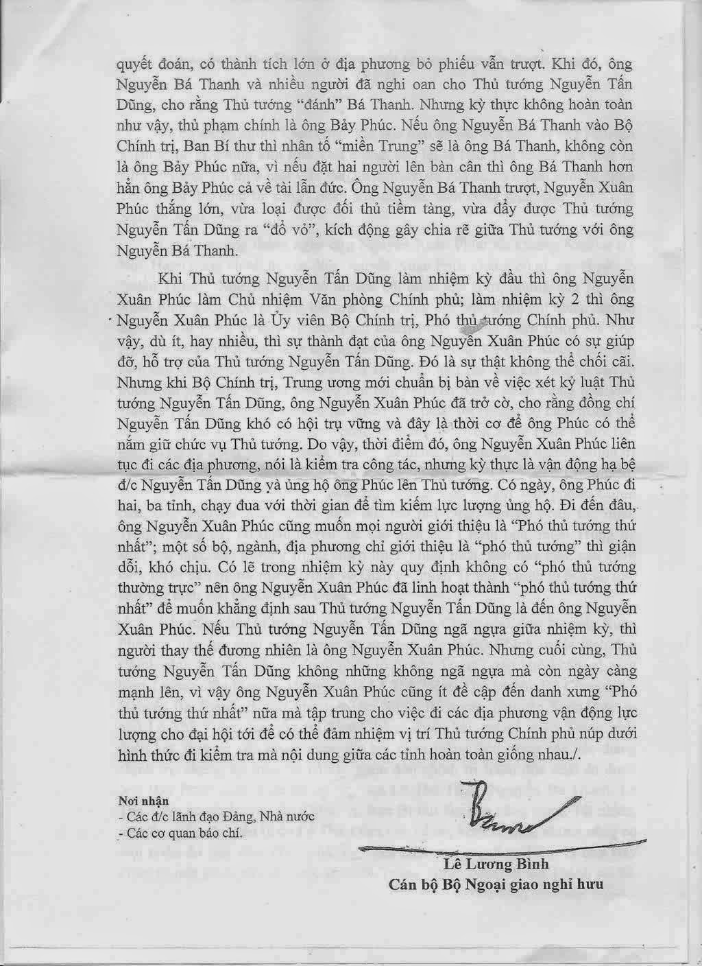 Tác giả bức thư ký tên Lê Lương Bình, tự nhận là một cán bộ ngoại giao đã nghỉ hưu. Ông Bình cáo buộc Phó Thủ tướng Nguyễn Xuân Phúc đã dùng đến 'tất cả các ngón đòn chính trị hiểm độc nhất' để triệt hạ uy tín và loại bỏ quyền lực của ông Nguyễn Bá Thanh, người hiện đang giữ chức Trưởng ban Nội chính trung ương.
