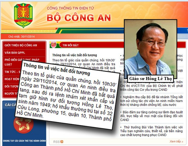 Cổng thông tin điện tử Bộ công an đưa tin bắt GS Hồng Lê Thọ hôm 30/11/2014-Screen capture