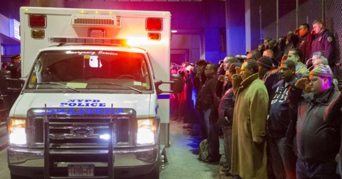 Xe cứu thương chở thi thể 2 cảnh sát viên bị bắn chết ở New York, ngày 20/12/2014.