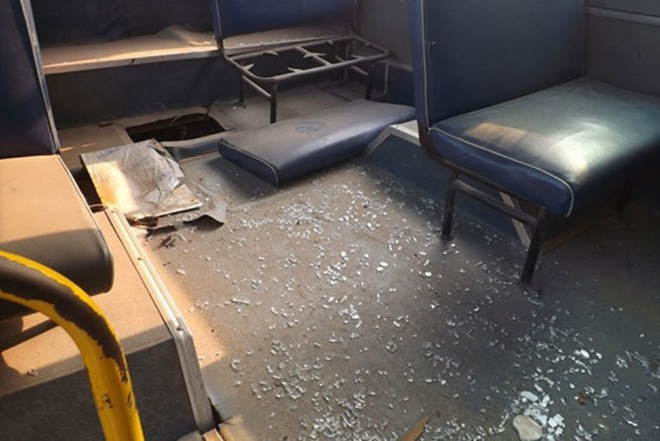 Nhiều mảnh vỡ của kính chắn gió rơi tung tóe khắp nơi trên xe buýt.