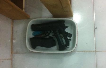 Súng ngắn thu giữ tại nơi trú ngụ của Tú “đĩ” và đồng bọn - Ảnh: Báo Dân Trí.