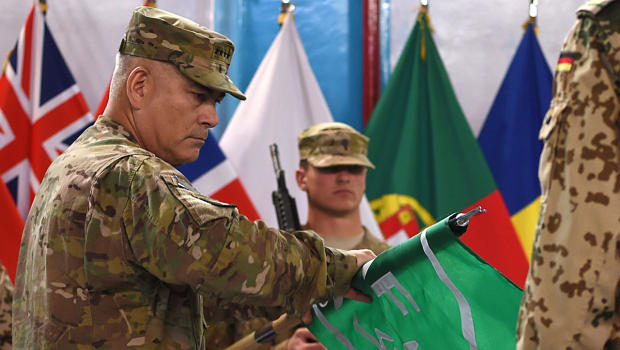 Tướng John Campbell cuốn lại cờ xanh bảo vệ an toàn quốc tế mà thay vào đó là cờ mới cho thời đại hòa binh hơn.