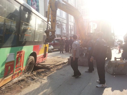 Trên đường di chuyển từ Hà Đông vào trung tâm Hà Nội, xe buýt số 39 bất ngờ bị mắc kẹt sau khi một bánh bị sập xuống đường thoát nước trên vỉa hè.