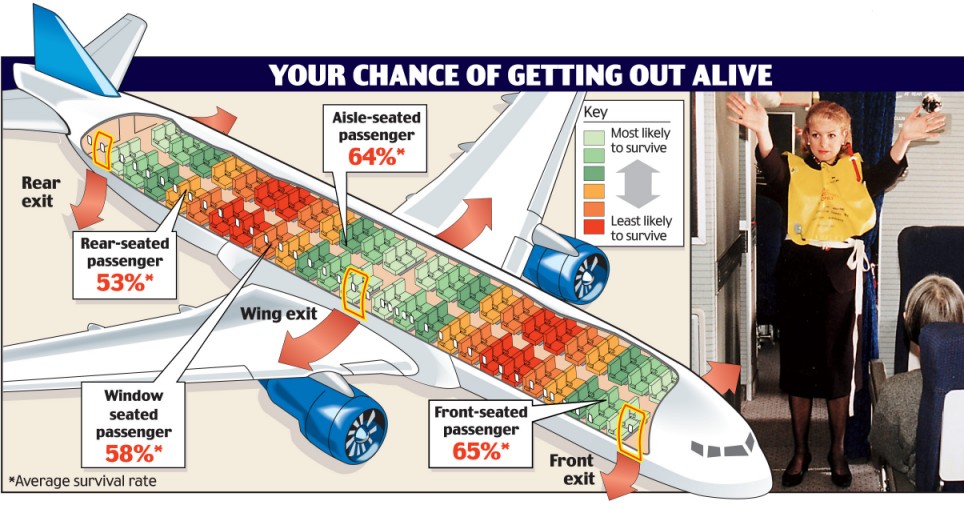 Vào năm 2008, báo Daily Mail cho thấy rằng: Các nhà khoa học ở đại học Greenwich (Anh) đã nghiên cứu khoảng 2.000 người may mắn sống sót trong 105 vụ tai nạn máy bay trên toàn thế giới. Kết quả hành khách ngồi sát lối đi thì có khả năng thoát chết cao hơn những người ngồi sát cửa sổ.