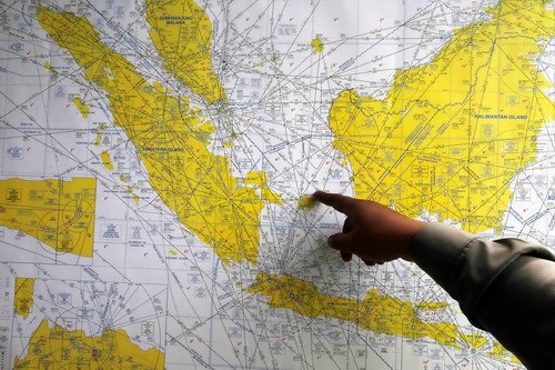 Một quan chức quân đội Indonesia đang chỉ tay vào địa điểm nghi là nơi máy bay QZ8501 rơi trên một tấm bản đồ - Ảnh: Reuters