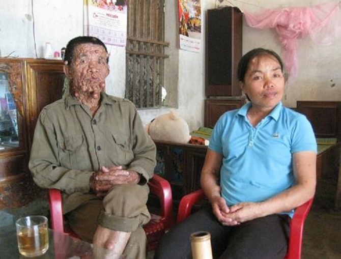 Vừa tới nhà, hiện ra trước mắt chúng tôi là một người đàn ông đứng tuổi, mang hình thù kỳ quái, ốm yếu, mặt nhợt nhạt đang ngồi đan những chiếc rổ tre. Thấy chúng tôi, ông vội lau những giọt mồ hôi còn ướt đẫm trên khuôn mặt méo mó, biến dạng bởi những khối u. Thấy khách lạ, ông nở nụ cười trông rất đáng thương.Trong căn nhà xập xệ, cũ kỹ ở xã miền núi Cẩm Lương, rót ly nước chè mời khách, ông Chu ngồi trầm ngâm, thi thoảng giơ cánh tay lên nhìn những khối u mọc chi chít, làm ông đau nhức không yên. Thấy có khách lạ đến nhà, ban đầu ông Chu có vẻ e ngại. Khi được hỏi bằng sự chân thành, đồng cảm sẻ chia, người đàn ông ấy mới chịu trải lòng với chúng tôi.