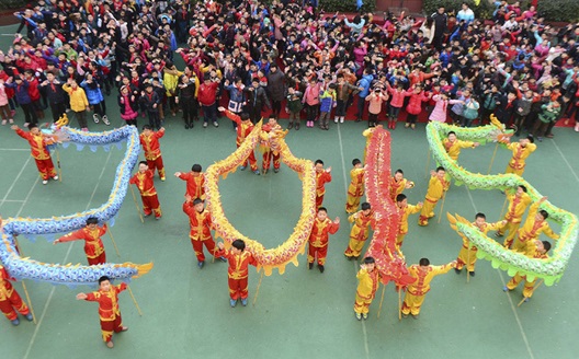 Học sinh một trường nghệ thuật ở thành phố Hợp Phì, tỉnh An Huy, múa lân và xếp hình số 2015 để chào đón năm mới.