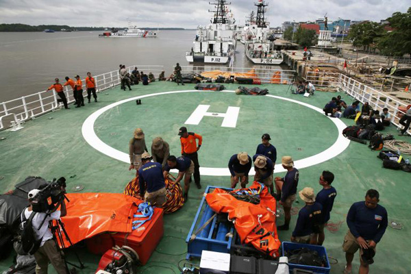Thợ lặn hải quân Indonesia chuẩn bị trên boong tàu cứu hộ Purworejo trước khi ra tham gia lặn tìm hành khách và máy bay AirAsia Indonesia mất tích trên biển Java, ở cảng Kumai, Pangkalan Bun (đảo Trung Kalimantan) ngày 1.1.2015 - Ảnh: Reuters |