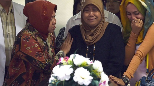 Trời mưa như trút và hai người thân khóc ngất khi thi hài cô giáo tiểu học người Indonesia có mặt trên chuyến bay QZ8501 gặp nạn hôm 28/12 được trao lại cho gia đình.