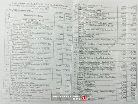 Quy định khung giá đất năm 2013 cho thấy, không có khu vực nào ở thành phố Thanh Hóa có mức giá 2,8 triệu đồng/m2 như phê duyệt tại dự án ở Khu đô thị mới Đông Hương.