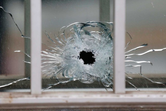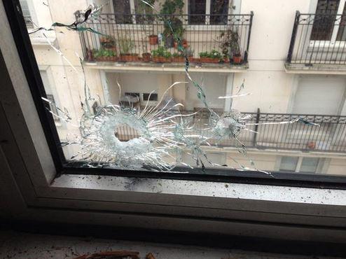 Một viên đạn xuyên qua cửa kính văn phòng tòa soạn. Ảnh: AFP
