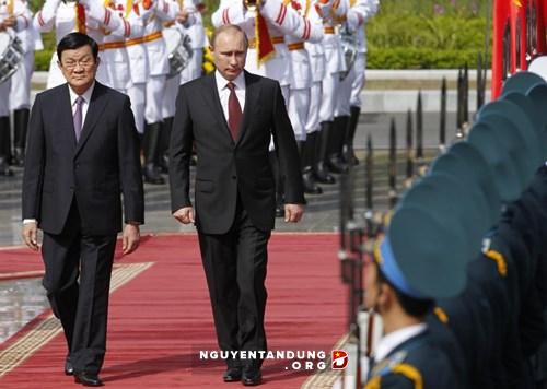 Chủ tịch nước Trương Tấn Sang tiếp Tổng thống Nga Vladimir Putin thăm chính thức Việt Nam. Ảnh: SCMP.