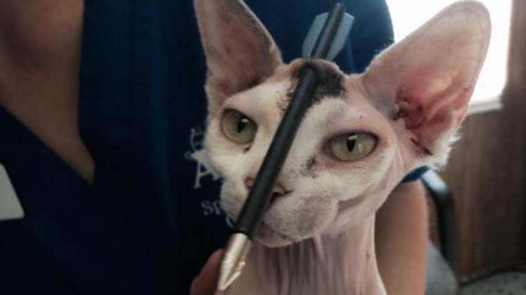 Con mèo bị trúng tên xuyên đầu và được chủ nhân tìm thấy ở một bụi rậm trong vườn, người sau đó đã mô tả nó là "thoát chết trong gang tấc".