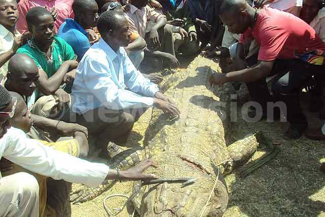 Người dân ở thành phố Kampala, Uganda vây quanh con cá sấu mà Mubalak giết. Ảnh: New Vision