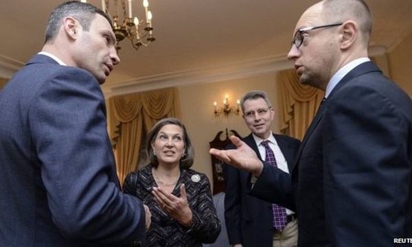 …Vào ba tuần trước khi cuộc nổi dậy ở Kiev cao trào, Bộ Ngoại giao Mỹ lên kế hoạch loại bỏ các nhân vật thân tín với Tổng thống Viktor Yanukovych và chọn các nhà lãnh đạo mới cho Ukraine. Cuộc trò chuyện giữa Trợ lý Ngoại trưởng về các vấn đề châu Âu Victoria Nuland và Đại sứ Mỹ tại Kiev, Geoffrey Pyatt đã phơi bày điều đó. Đoạn hội thoại bị ghi âm lại có nội dung như sau: