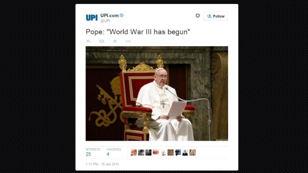 Trong khi đó, tài khoản Twitter của United Press International (UPI) đăng thông báo: "Giáo hoàng Francis: Chiến tranh Thế giới thứ III đã nổ ra".