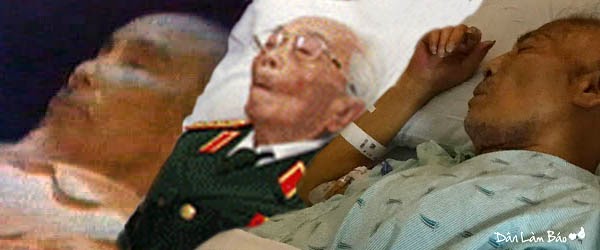 Và rồi đây này! Võ Nguyên Giáp nằm ngắc ngoải ở giường bệnh, vẫn được tướng lãnh đàn em đồng phục đại cán kéo đến hầu. Phùng Quang Thanh nắm lấy bàn tay khô héo của Võ tướng quân ra chiều luyến tiếc? Các quan chức dân sự ăn vận còm-lê đại lễ vui cười hớn hở, chắc là chúc thọ đại tướng bách niên... giai lão, trong khi đại tướng đang như xác không hồn!