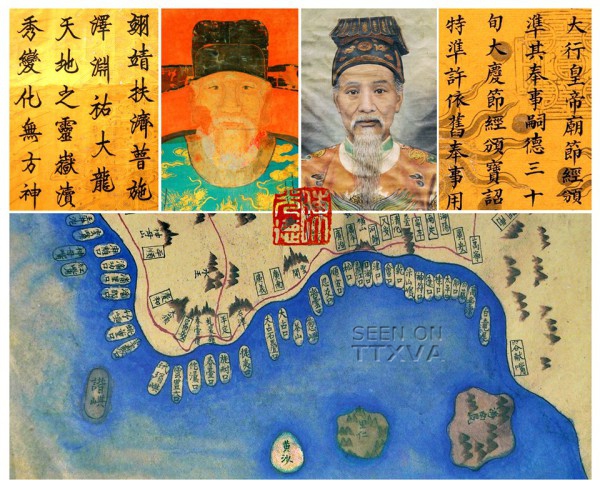 Ảnh (trái qua phải, trên xuống dưới) : 1. Sắc phong thời Lê ; 2. Tranh chân dung Nguyễn Trãi ; 3. Tranh chân dung Tùng Thiện vương ; 4. Sắc phong thời Nguyễn ; 5. “Thiên Nam tứ chí lộ đồ” với đảo Hoàng Sa nằm ở chính giữa, phía dưới bản đồ.