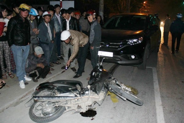 Tại hiện trường, chiếc ô tô cùng xe máy gặp nạn nằm sát bên vỉa hè bên phải. Một vệt phanh dài cùng nhiều vết máu in rõ trên mặt đường.
