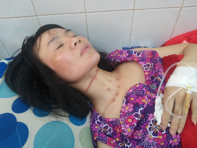 Chị Linh đang được điều trị tại Bệnh viện Đa khoa tỉnh Gia Lai, trên cổ còn nhiều vết bầm tím.