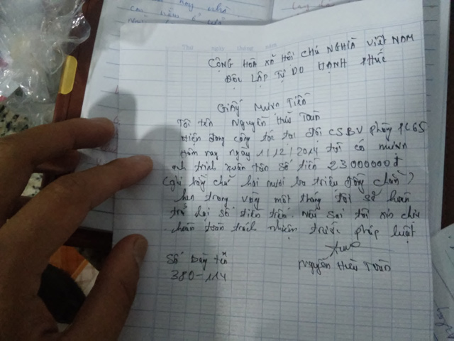 Gia đình anh Tân đã cung cấp một tờ giấy mà gia đình nói Toàn đã viết ghi nợ, với nội dung: Nguyễn Hữu Toàn (hiện đang công tác tại Phòng PC65 Công an Gia Lai, Số bảng tên 380-114) vay nợ anh Tân ngày 1.12.2014 số tiền 23 triệu đồng.