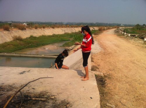 Kênh thoát nước dự án Thành phố mới Bình Dương đang được chặn dòng tích nước tưới cho cánh đồng hoa màu tại địa phương trong mùa khô hạn năm nay. Đoạn kênh có bảng cảnh báo nguy hiểm nguồn nước sâu 4m, cấm xuống tắm nhưng nhiều em vẫn tới đây ngụp lặn thường xuyên.