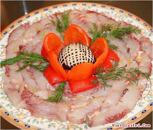 Bước 1: Thịt cá tầm sau khi lọc da, thái mỏng một phần, độ dày 1-2mm để ăn gỏi. Dùng đĩa sâu lòng cho đá viên xuống dưới, bọc qua lớp màng bọc thực phẩm rồi xếp cá lên trên (để cá giữ được độ tươi ngon). Khi ăn, các bạn vắt 1 quả chanh vào bát con, nhúng cá chín rồi chấm với mù tạt pha cùng xì dầu. Có thể ăn kèm với rau cải, dứa…