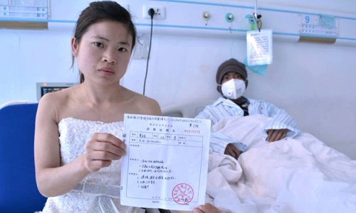 Giữa trưa nắng, Huang Xiju, 24 tuổi ở thành phố Côn Minh, Trung Quốc, mặc váy cô dâu, tay cầm tấm biển "tuyển chồng khẩn cấp", với hy vọng người này sẽ giúp chi trả tiền chữa bệnh cho anh trai cô bị bệnh máu trắng.Theo CCTV News, Xiju sẵn sàng lấy bất cứ ai có thể giúp anh trai cô có tiền chữa bệnh. Do đó, chú rể của Xiju tìm phải vừa hào phóng lại vừa giàu có. Trên mảnh giấy Xiju cầm theo có ghi hóa đơn y tế của anh trai hiện lên tới hơn 48.000 USD. Đứng cạnh Xiju trong bộ quần áo bệnh viện ở bến tàu của thành phố Côn Minh, tỉnh Vân Nam hôm 24/1, là anh trai cô, Huang Xichao. Xichao cũng cầm theo rất nhiều giấy tờ của bệnh viện.