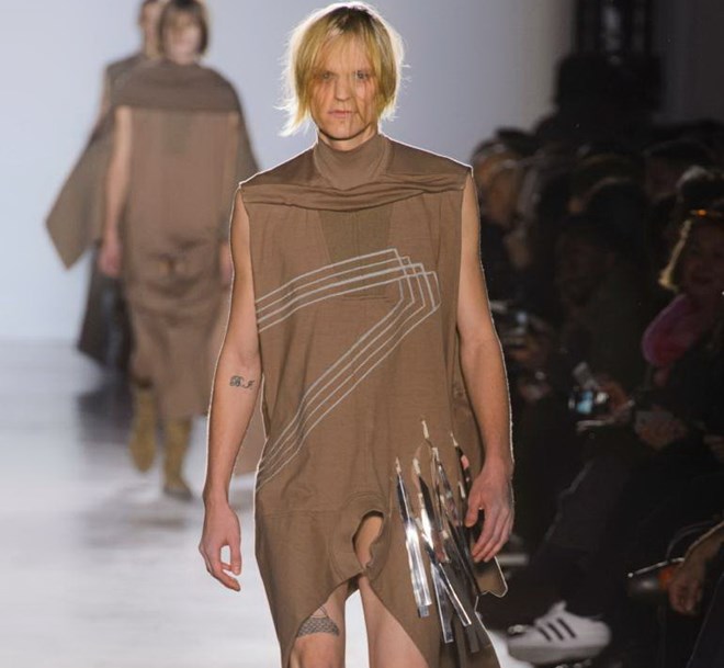 Trong tuần lễ thời trang nam diễn ra tại Paris, Pháp hôm 22/1 vừa qua, Rick Owens, nhà thiết kế chuyên về đồ Grunge thể thao, đã đưa những người mẫu lên sàn diễn với những bộ đồ không che phần nhạy cảm.