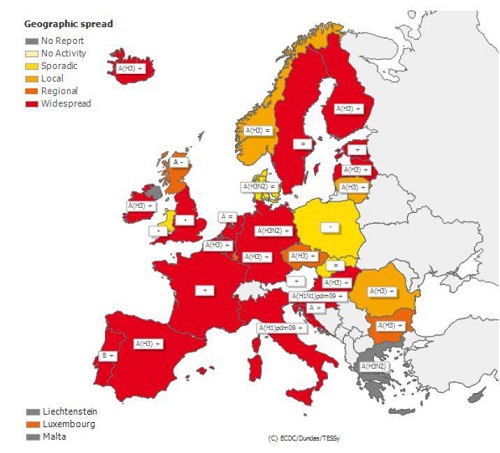 Khắp Châu Âu đang có dịch cúm, số người đến bác sĩ ra tăng theo WHO và Trung Tâm chữa bệnh phòng bệnh dịch của Châu Âu.