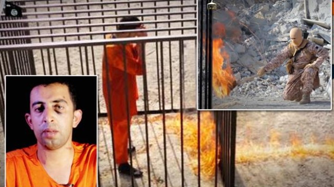 Đoạn video dài 22 phút được IS tung lên mạng cách đây không lâu quay cảnh thiếu úy phi công Kasasbeh tỏ ra bình thản một cách đáng ngạc nhiên khi bị nhốt trong một chiếc lồng với bộ quần áo ướt đẫm xăng. Viên phi công này cũng không hề tỏ ra sợ hãi khi một chiến binh IS châm ngọn đuốc vào vệt xăng dẫn đến chiếc lồng sắt.