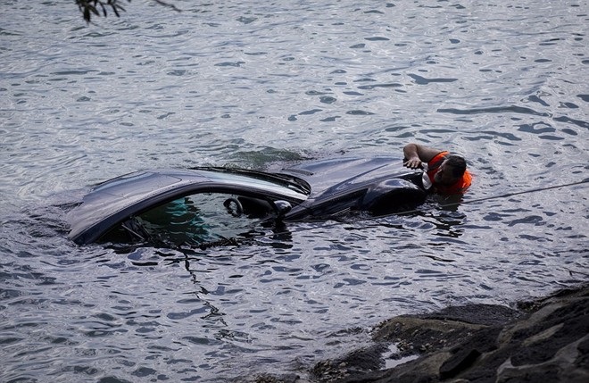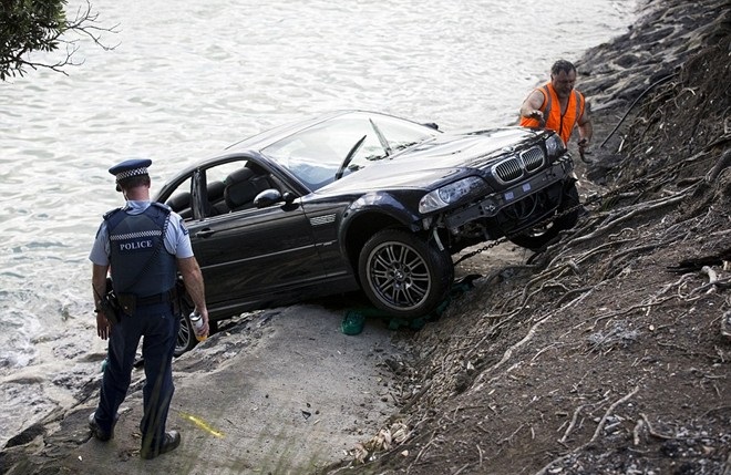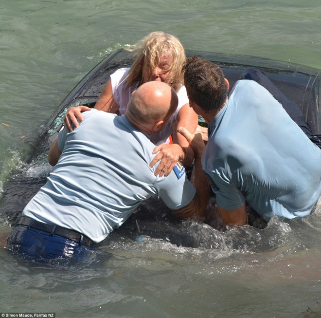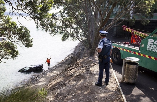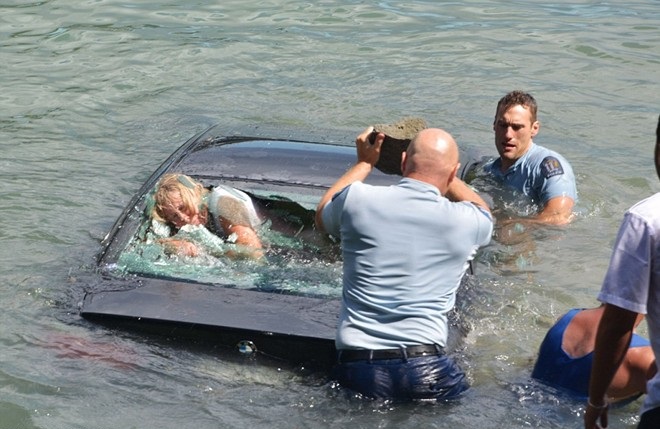 Vietbf.com - cảnh sát New Zealand dùng hòn đá để đập vào kính xe để cứu một người đàn bà vì chiếc xe lao xuống nước ở cảng Waitemata, thành phố Aucland, New Zealand hôm 17/2. Người người đàn bà trong xe không thể mở cửa ra được .