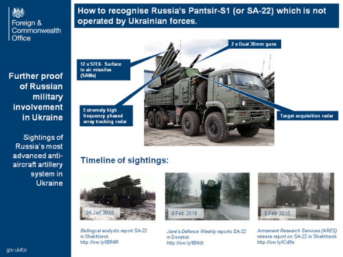 Theo tin tức trên Reuters, Bộ Ngoại giao Anh đã đưa ra bức ảnh đồ họa, cung cấp thông số chi tiết của hệ thống tên lửa đất đối không SA-22 gắn trên xe tải của Nga. Các bức ảnh khẳng định sự hiện diện của vũ khí Nga ở miền đông Ukraine."Sự hiện diện của SA-22 ở miền đông Ukraine tiếp tục là bằng chứng về sự tham gia trực tiếp của quân đội Nga trong cuộc xung đột", Reuters dẫn lời đại sứ Anh tại NATO, Adam Thomson tuyên bố khi công khai những hình ảnh qua Twitter.