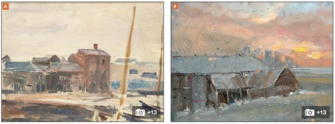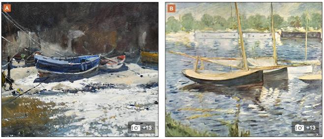 “Sóng gợn bên sông”. Cùng là hình ảnh đôi thuyền không người chìm trong ánh nắng chiều dần tắt nhưng thật không dễ để chỉ ra bức họa bên phải là của Édouard Manet vĩ đại và bức họa bên trái do Kieron vẽ. Bức Nắng mặt trời vùng Siathes (trái) được định giá 11 nghìn bảng Anh (tương đương hơn 360 triệu đồng).